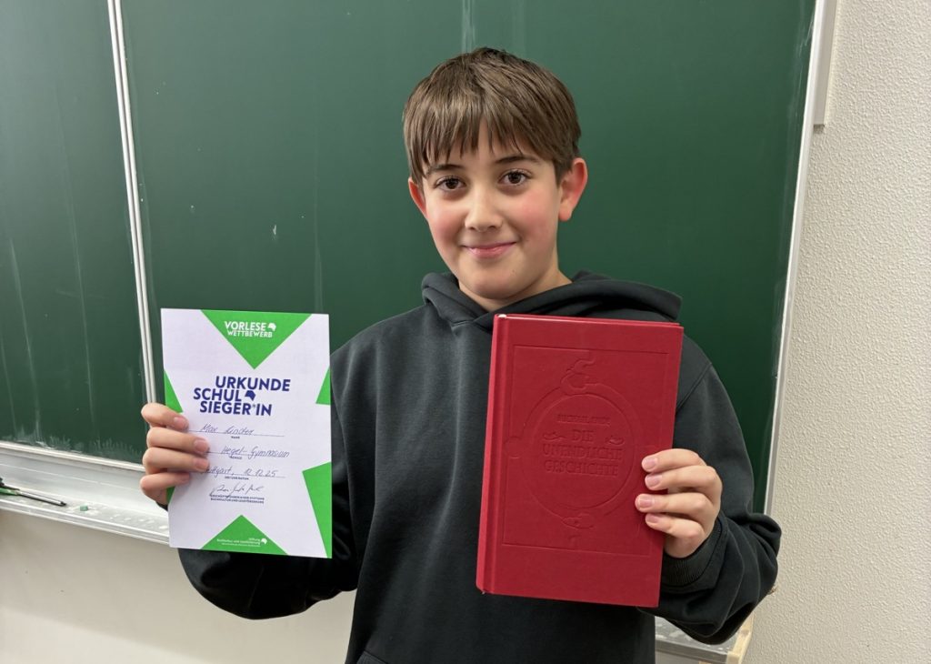 Für die Klasse 6a nahm Johannes teil und überzeugten mit einem konzentrierten und ausdrucksstarken Vortrag. Für die Klasse 6c sprang kurzfristig Floris ein, da die eigentliche Klassensiegerin Anastasia krankheitsbedingt nicht teilnehmen konnte. Trotz des spontanen Einsatzes und der kurzen Vorbereitungszeit meisterte er seine Aufgabe sehr souverän. Aus der Klasse 6d trat Malia an und überzeugte mit einem sicheren Lesevortrag und einem guten Gespür für Text und Stimmung. Die Klasse 6b wurde mit einem Beitrag aus „Die unendliche Geschichte“ von Michael Ende durch Max vertreten; dieser Vortrag begeisterte die Jury besonders und führte schließlich zum Gewinn des Schulentscheids. Er vertritt nun die Schule im Februar 2026 auf regionaler Ebene beim Stadtentscheid.