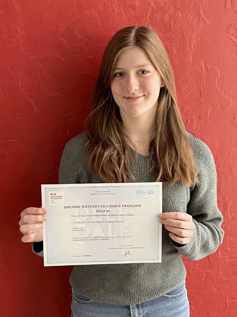 Zu den Schüler*innen, die im Rahmen der AG das DELF-Examen auf dem Niveau B1 ablegen, gehört Jolanda (jetzt in der Kursstufe 1); sie nahm im vergangenen Schuljahr die mehrstündige schriftliche Prüfung und das mündliche Examen am Institut français auf sich – mit Bravour!!