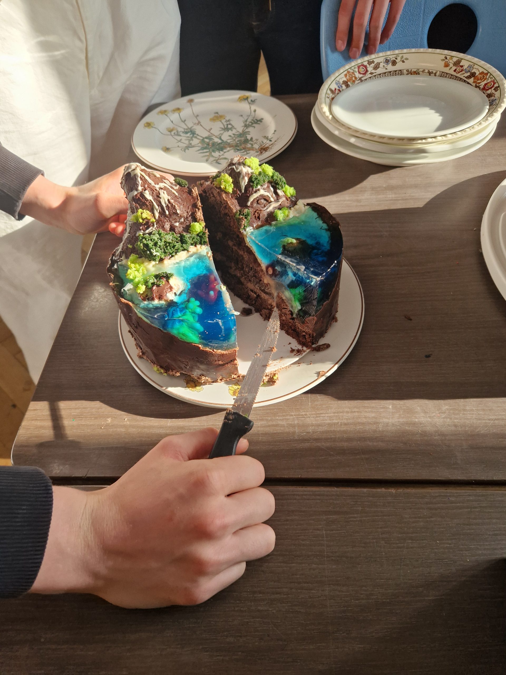 Der Kuchen wurde dem Kurs präsentiert, aufmerksam betrachtet und von allen Seiten bewundert. Im Anschluss folgte der wohl spannendste Teil der Präsentation: Gemeinsam wurde das Kunstwerk „zerlegt“, probiert und genossen. Der ganze Kurs beteiligte sich mit großer Begeisterung – und stellte fest, dass Kunst nicht nur zum Anschauen, sondern auch zum Schmecken sein kann. Eine rundum gelungene GFS, die gezeigt hat, wie vielseitig und lebendig das Fach Kunst sein kann.