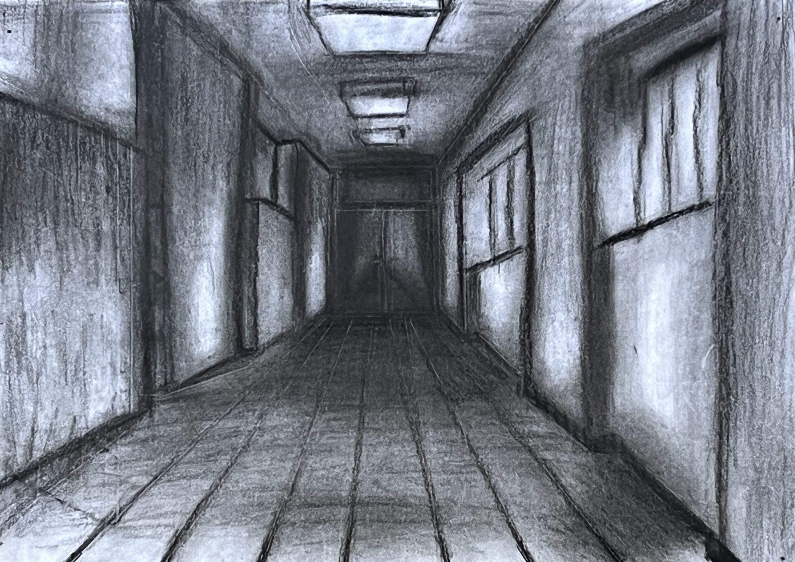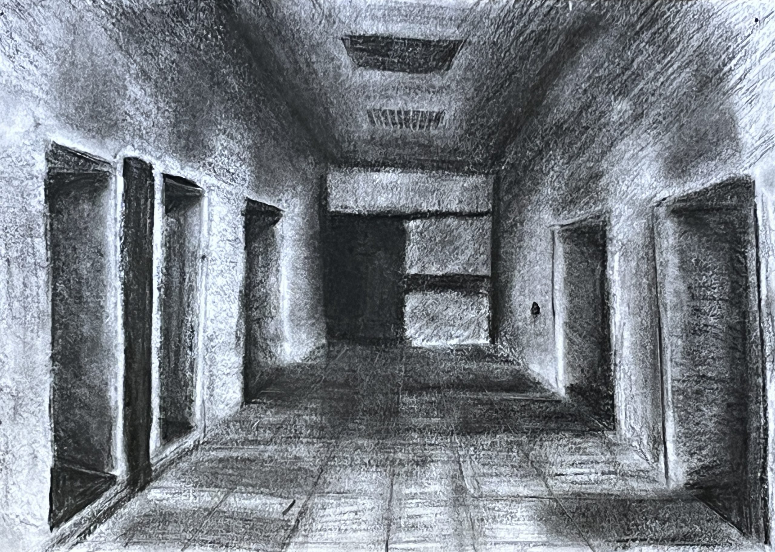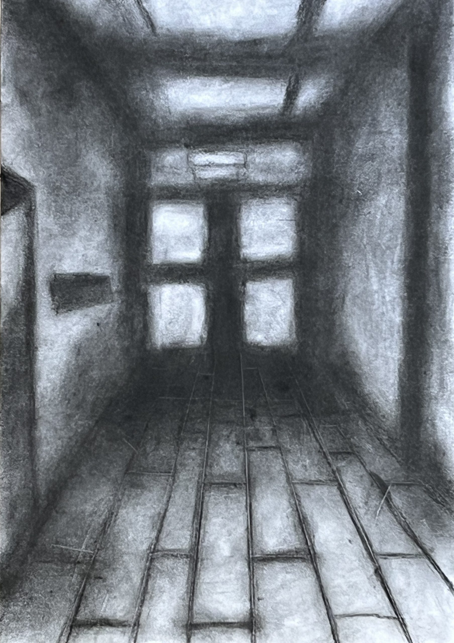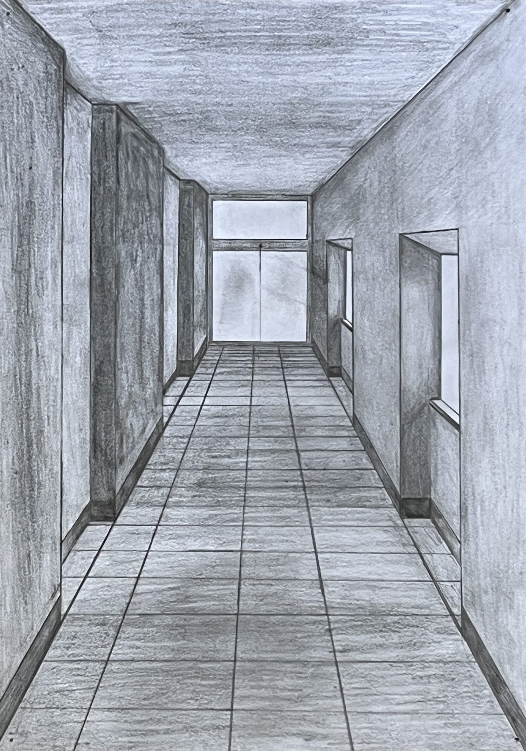 Ausgehend von ihrem Wissen um räumliche Darstellung mit einem Fluchtpunkt haben unsere Schüler*innen der Klassen 8a und 8c Ansichten von Fluren im Hegel-Gymnasium festgehalten. Maßgeblich für die Darstellung war die Wahrnehmung und das Festhalten der Lichtverhältnisse in den sich strukturell ähnelnden, aber in ihrer Wirkung doch verschiedenen Bereichen des Schulhauses.