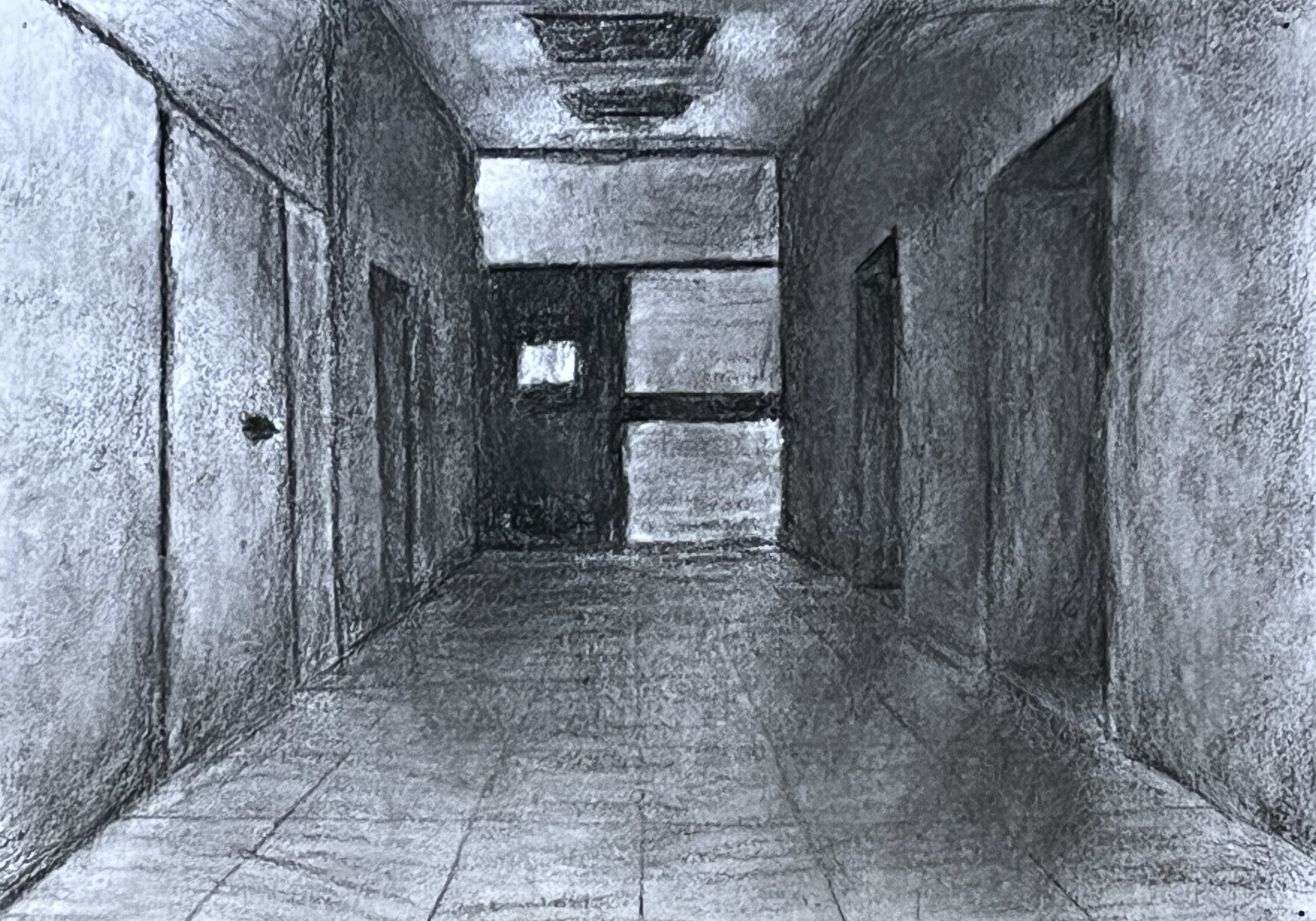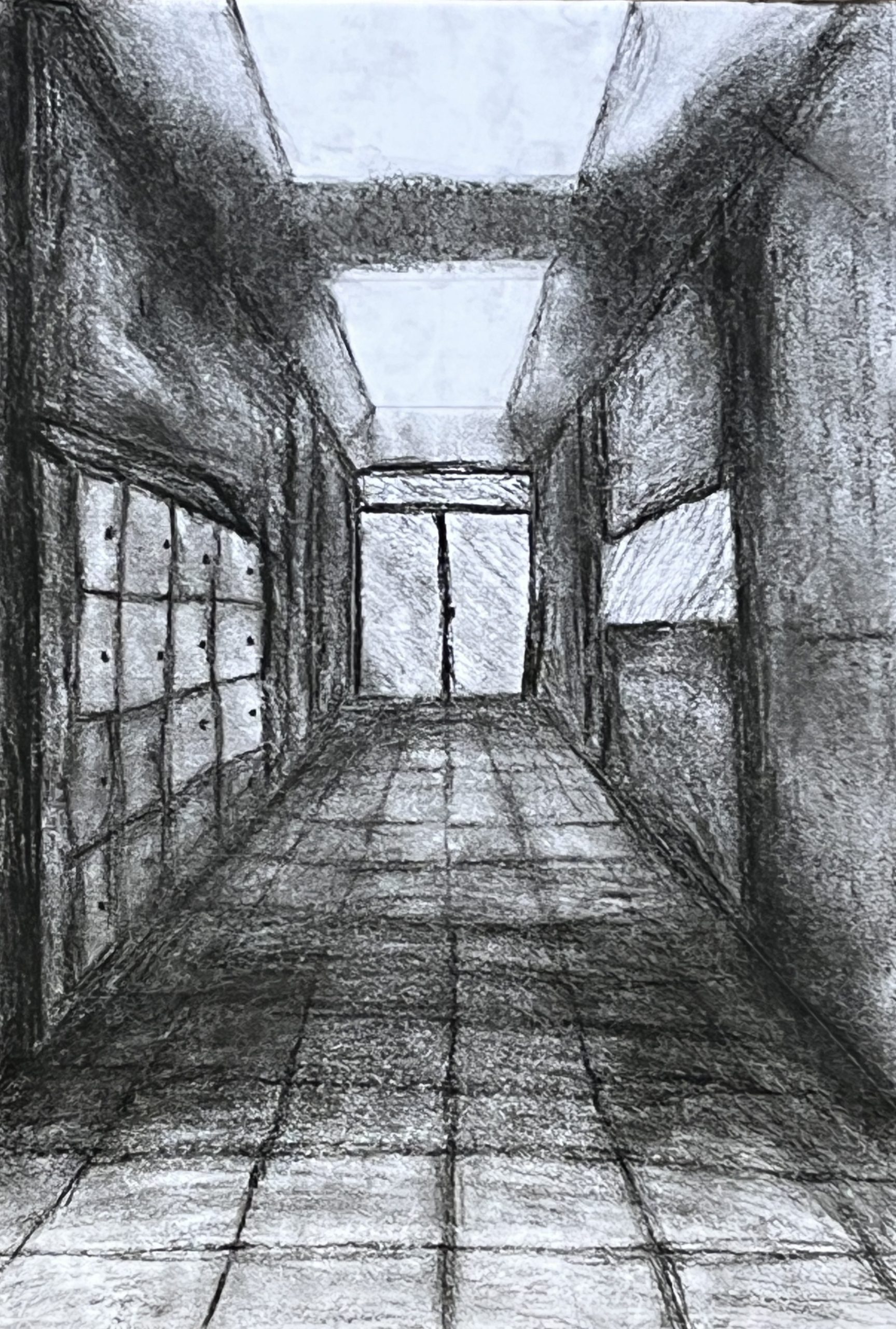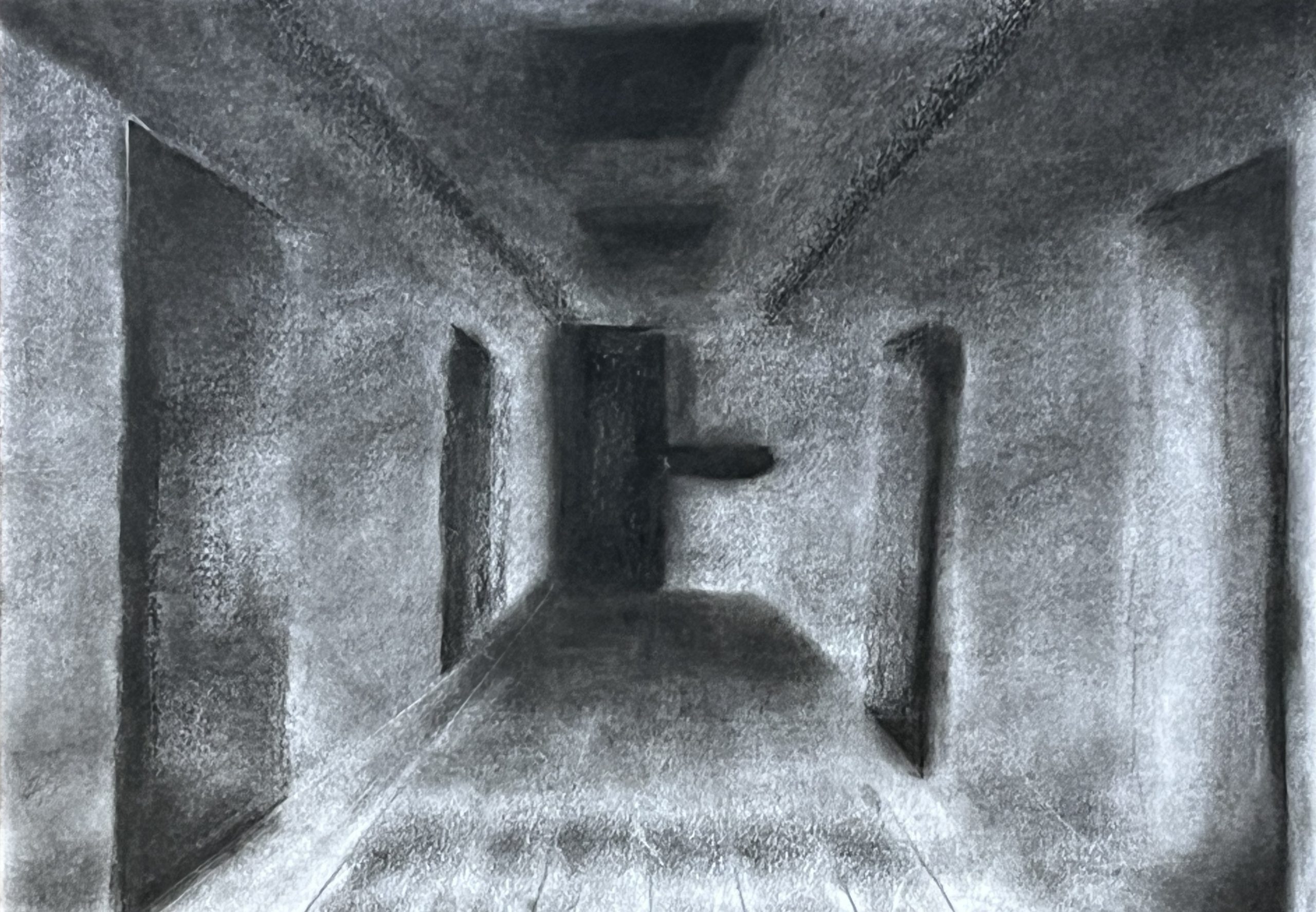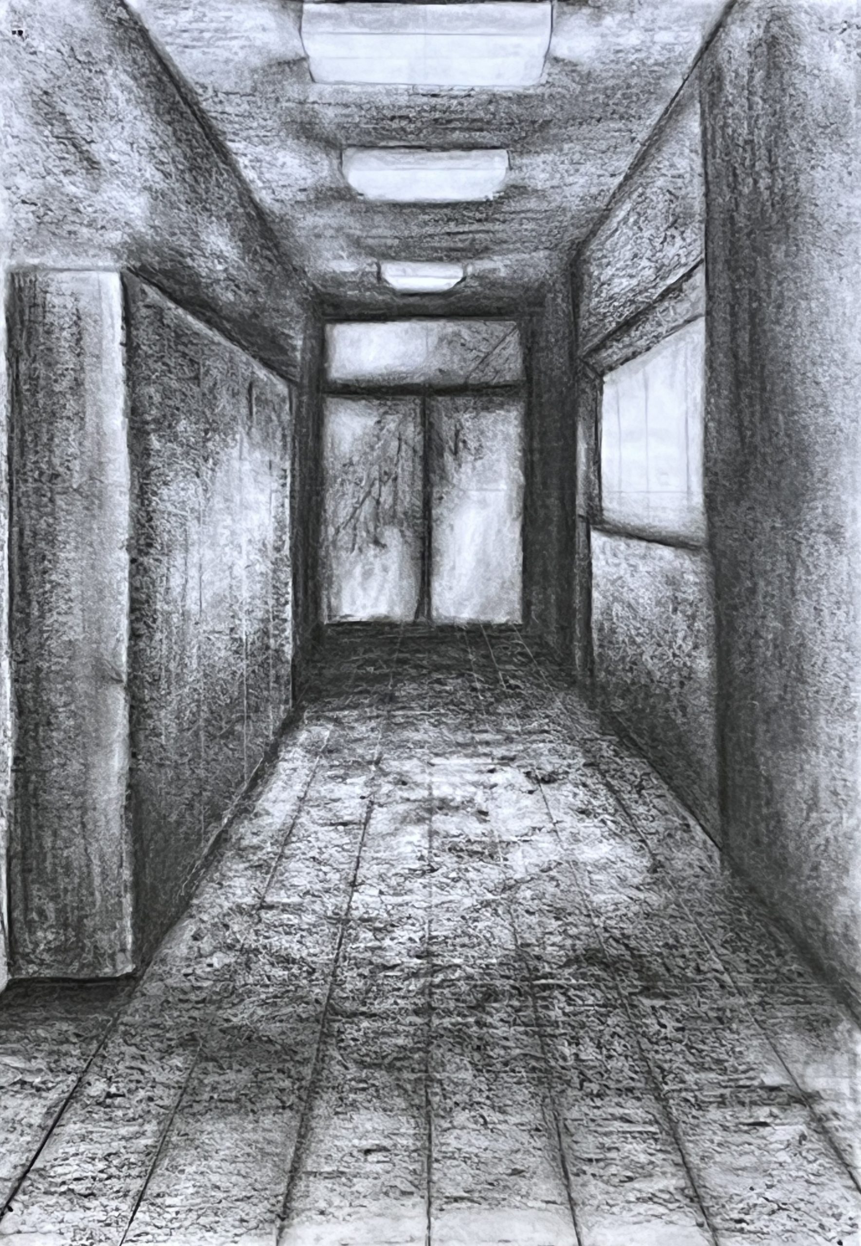 Ausgehend von ihrem Wissen um räumliche Darstellung mit einem Fluchtpunkt haben unsere Schüler*innen der Klassen 8a und 8c Ansichten von Fluren im Hegel-Gymnasium festgehalten. Maßgeblich für die Darstellung war die Wahrnehmung und das Festhalten der Lichtverhältnisse in den sich strukturell ähnelnden, aber in ihrer Wirkung doch verschiedenen Bereichen des Schulhauses.